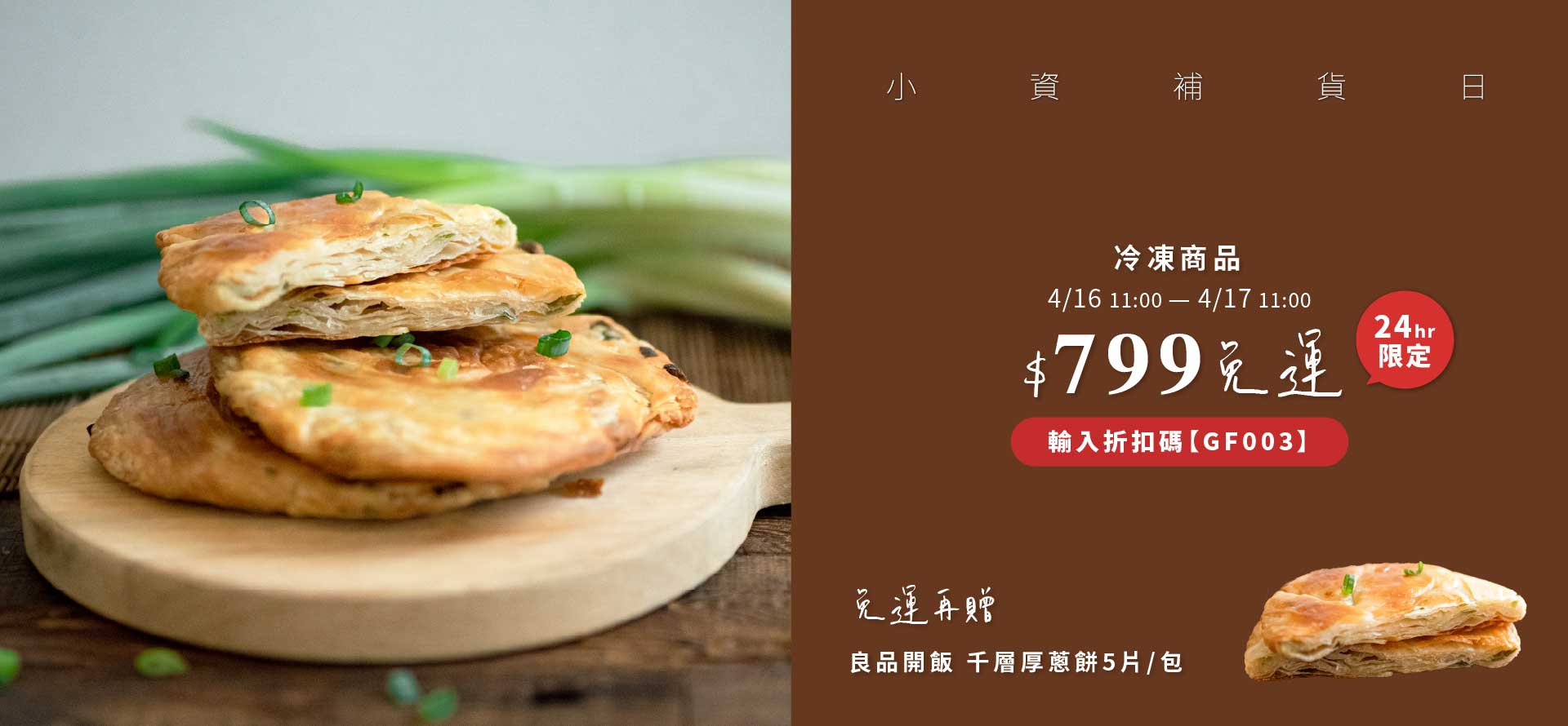 【小資補貨日】全館滿799免運,結帳輸入【GF003】再送千層厚蔥餅,限時24hr搶購!
